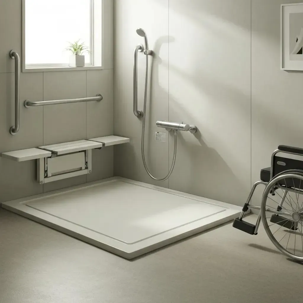 ADA guidelines specify that a curb-free threshold should not exceed 1/2″ and require clear floor space for wheelchair maneuverability (at least 30″×48″). Proper placement of grab bars, typically between 33″ and 36″ from the floor, and ensuring controls are within easy reach are also key for full compliance. Incorporating these standards during the planning phase helps avoid costly changes mid-project and aligns perfectly with universal design principles.