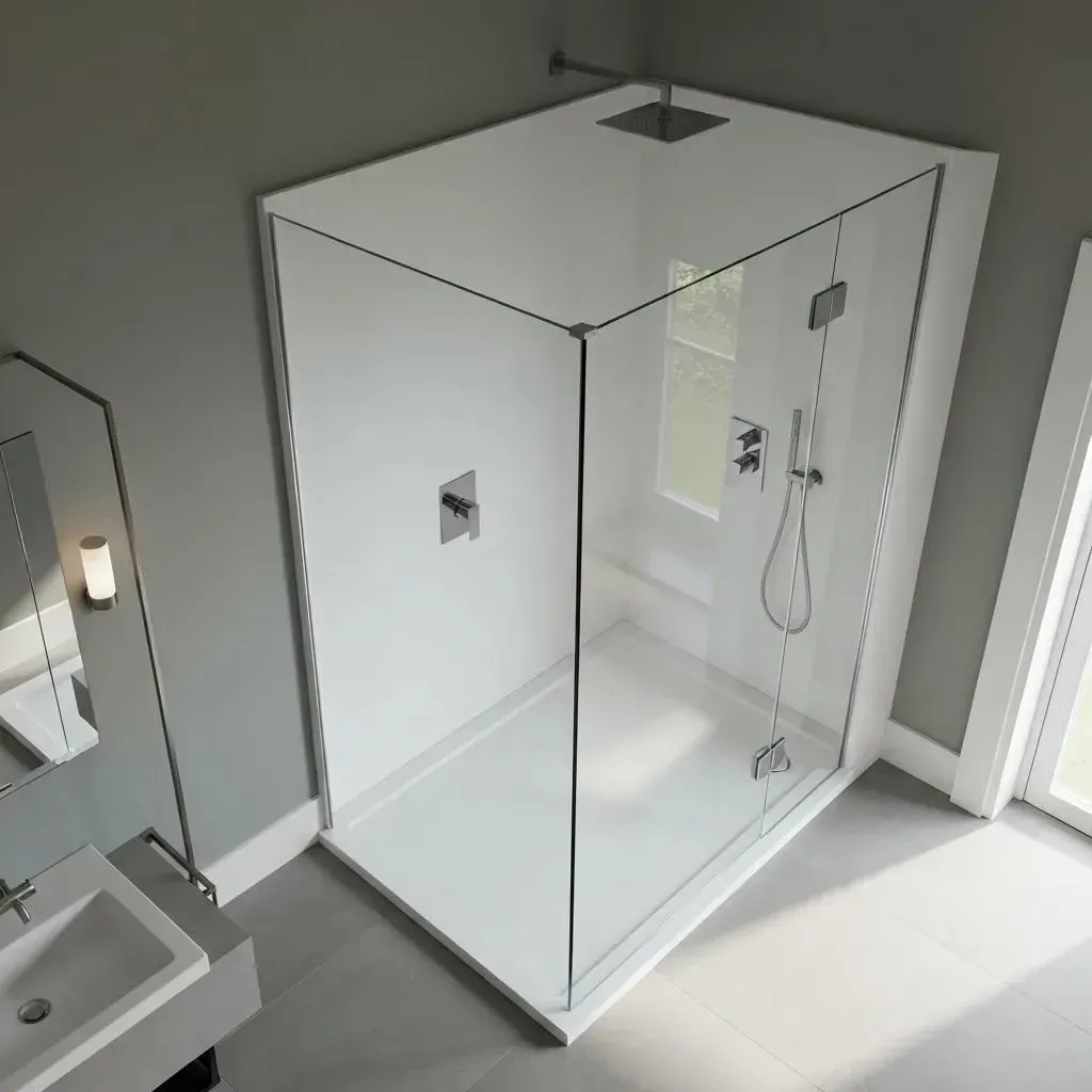 - Glass Enclosures: We typically use 3/8″–1/2″ thick tempered frameless glass panels to create that open, modern look.